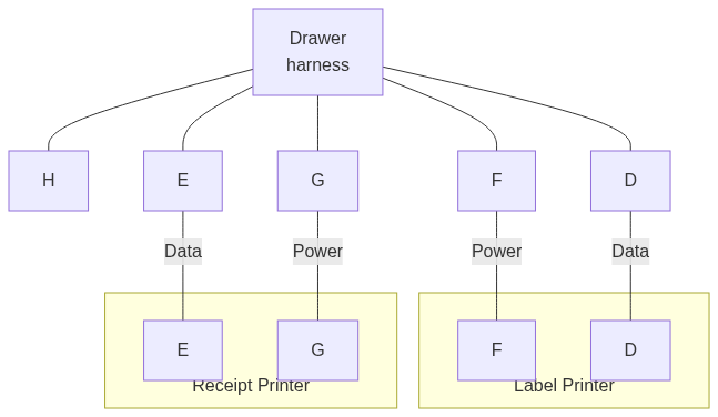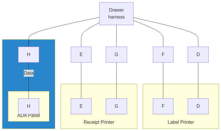 cover of finger duct bracket.OMNI harness as shown in designated slot.cover to secure end of harness.OMNI Harness to the Sub-System by plugging in the appropriate connections.Label Catch on outside face of the Drawer. Remove temporary label.Label Catch.Label Printer and Receipt Printer inside Drawer area and labeled connections.Printers into approximate locations face down in order to access rear connections.Label Printer and Receipt Printer as labeled.