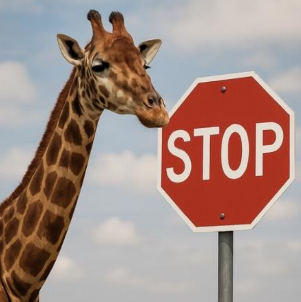 a photo of a brown giraffe and a white stop sign.png